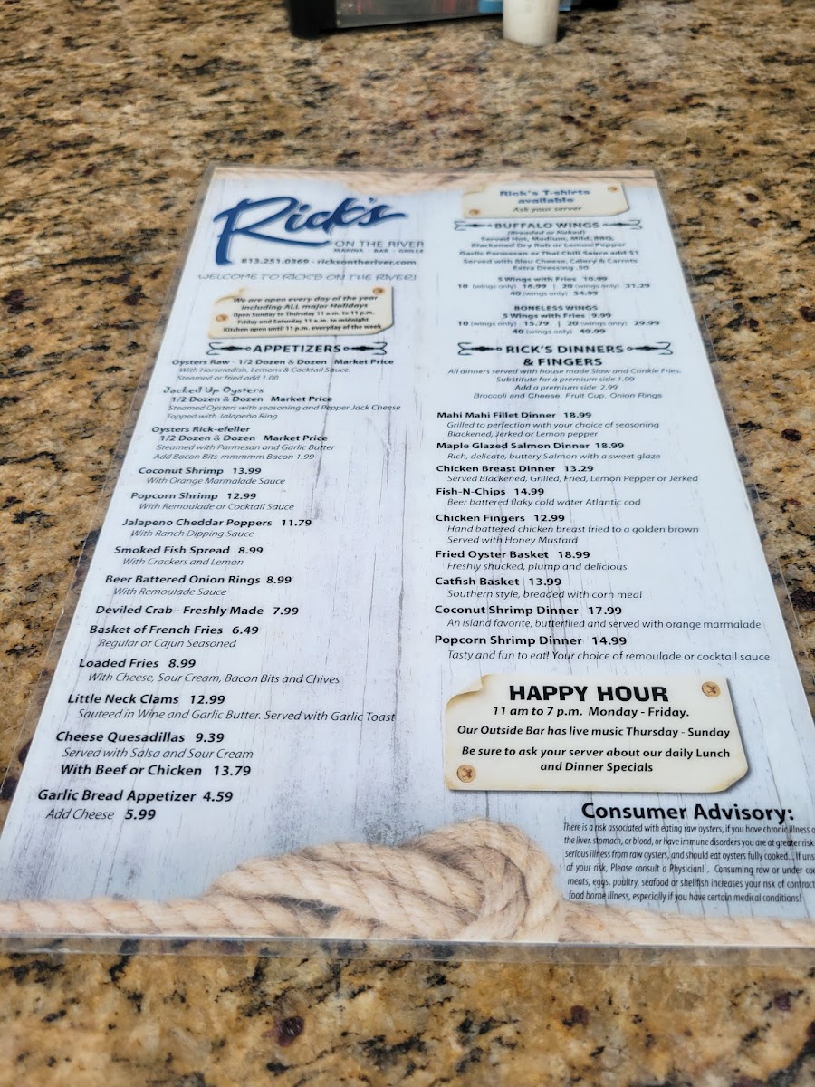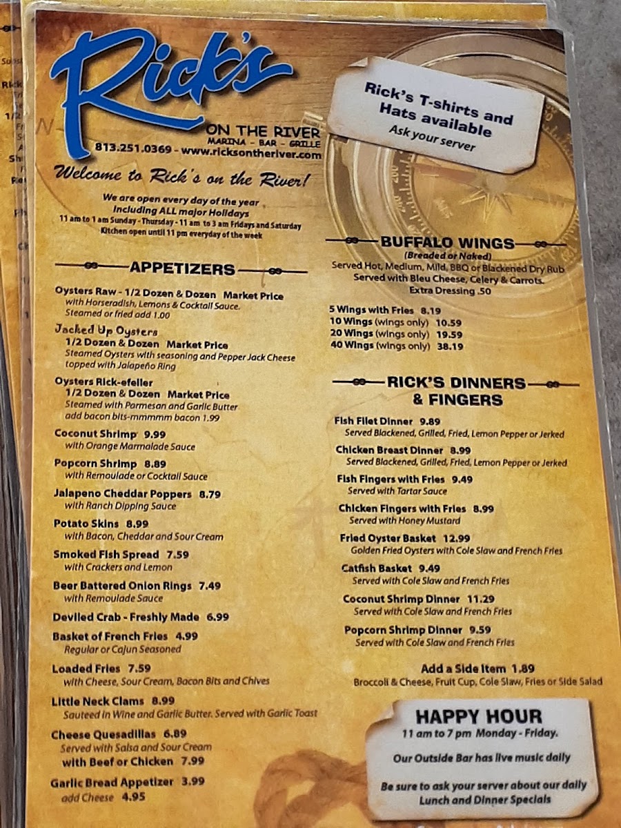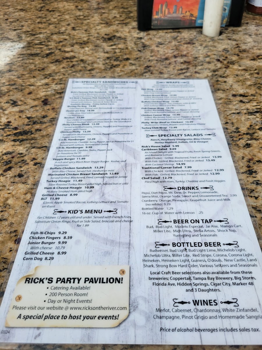 Welcome to Rick's on the River, a charming bar and grill located along the banks of the scenic Hillsborough River in Tampa, Florida. This establishment provides a laid-back atmosphere where the essence of Florida comes alive, making it a perfect spot for locals and visitors to unwind. With a blend of classic bar fare and flavorful seafood, Rick's offers a menu that is both satisfying and family-friendly.