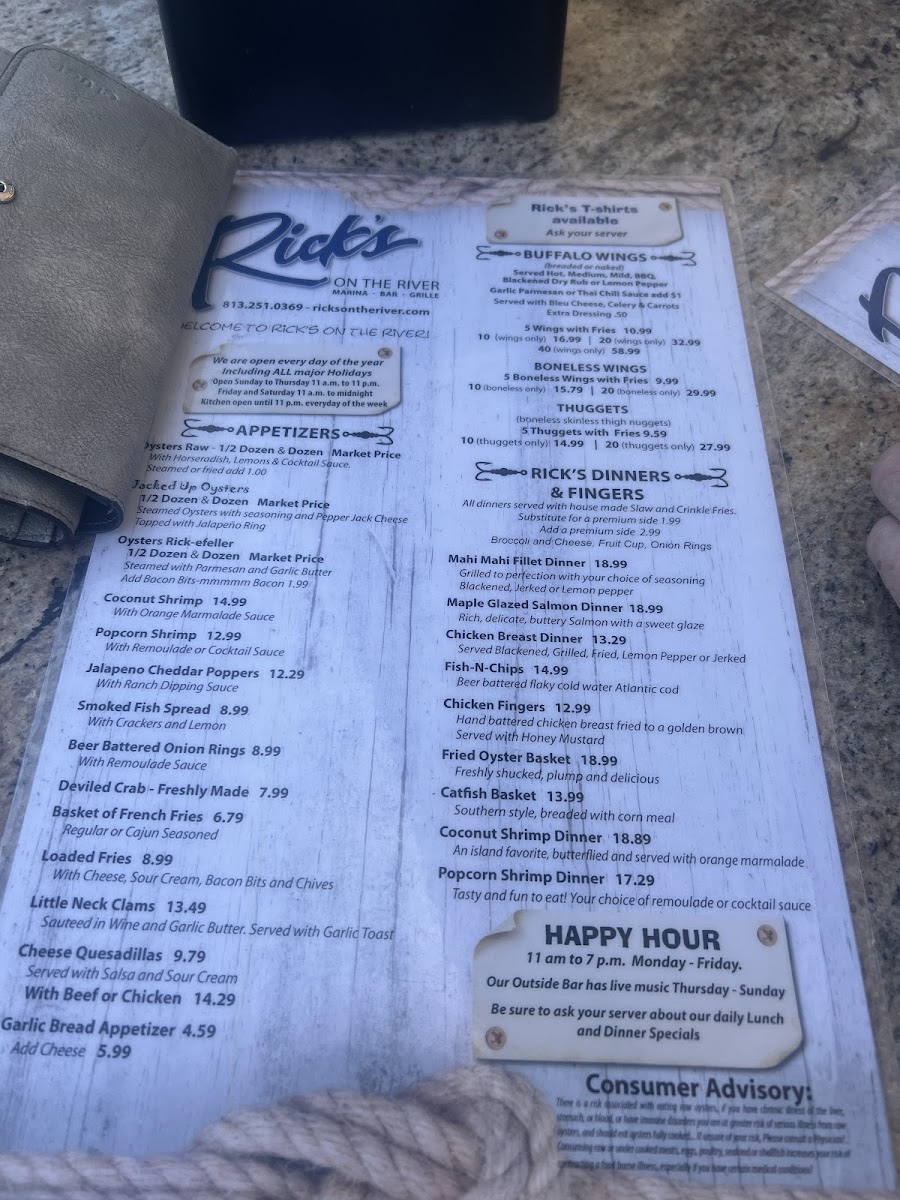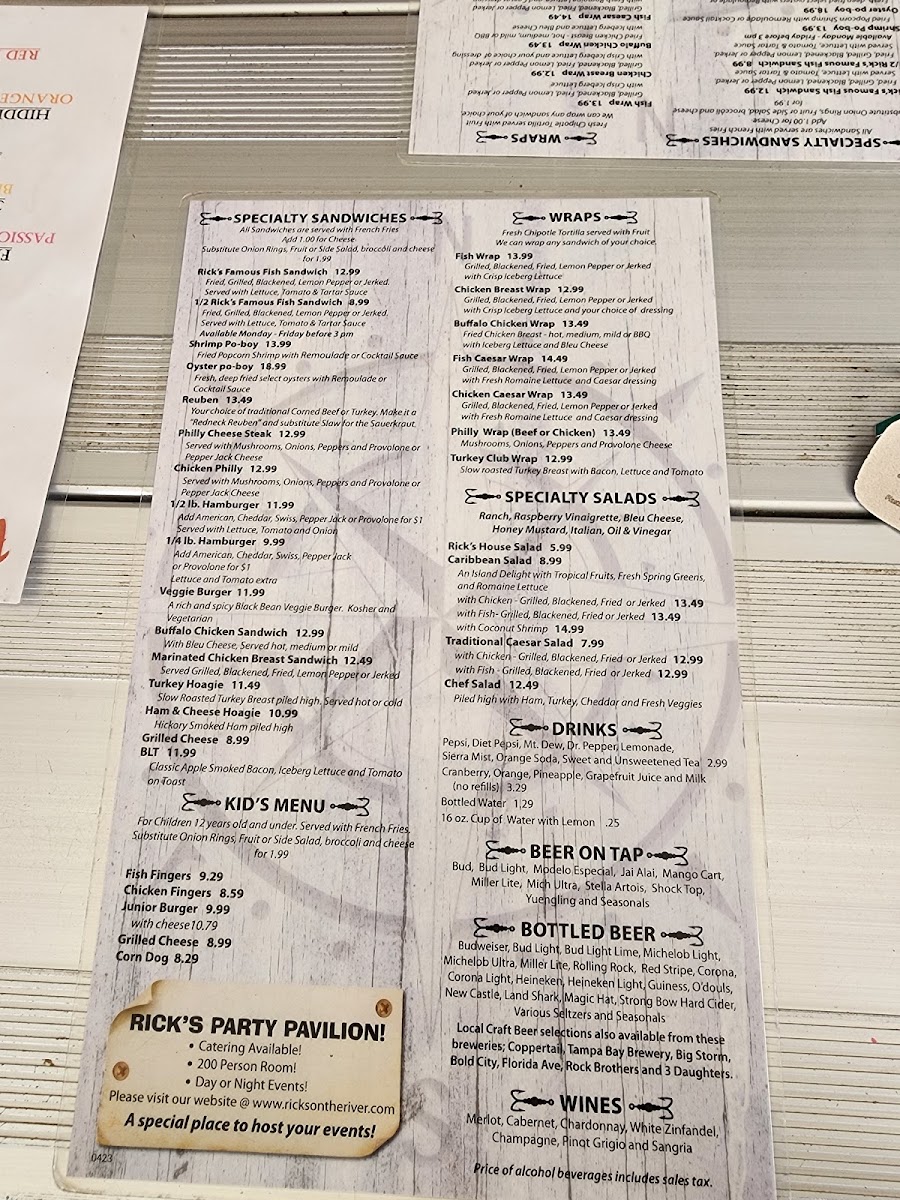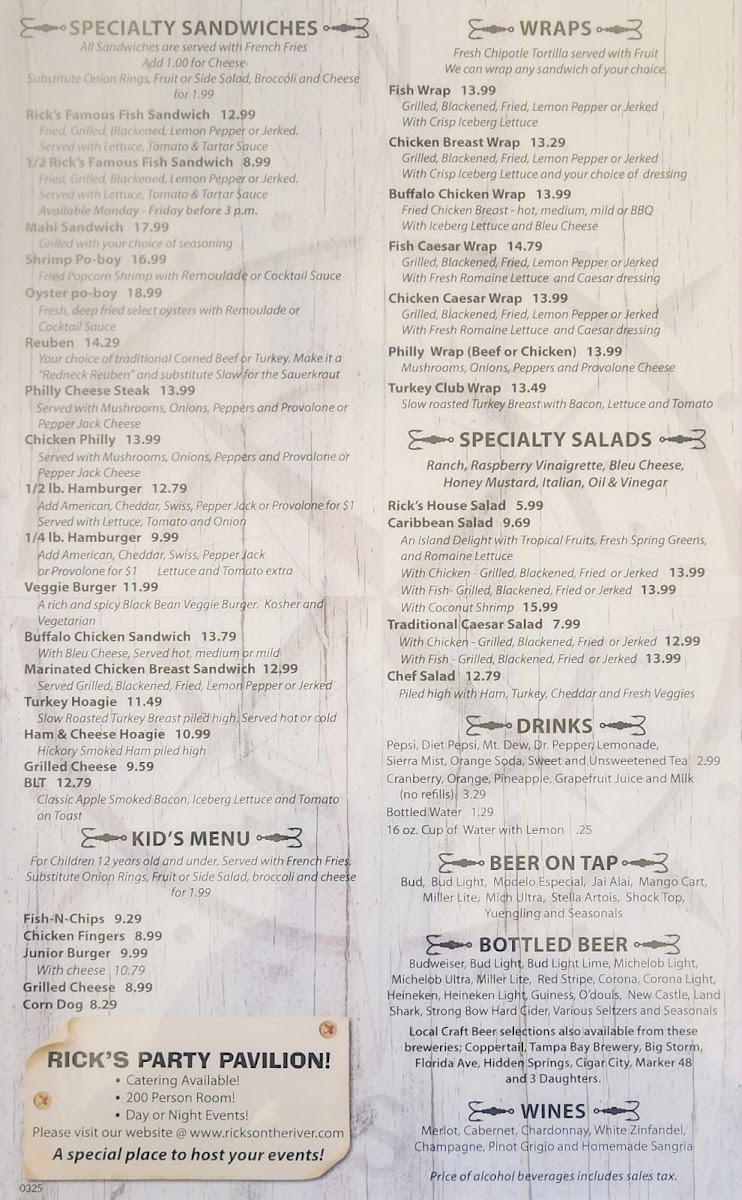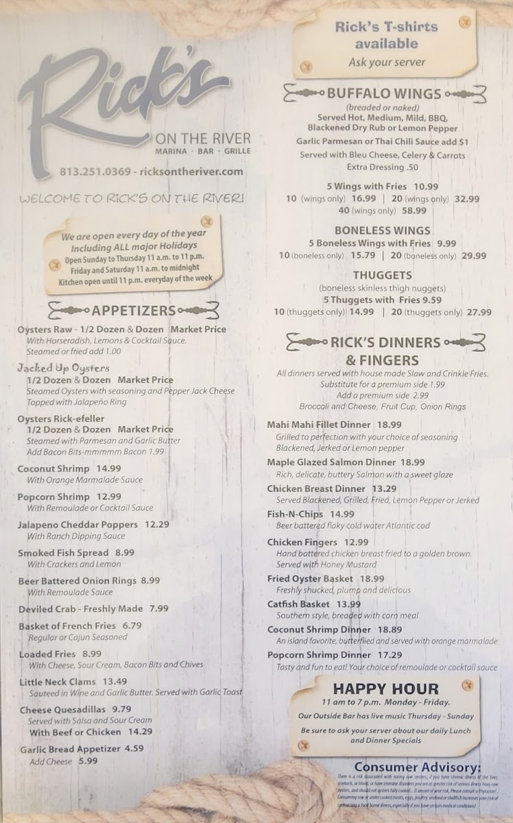 Welcome to Rick's on the River, a charming bar and grill located along the banks of the scenic Hillsborough River in Tampa, Florida. This establishment provides a laid-back atmosphere where the essence of Florida comes alive, making it a perfect spot for locals and visitors to unwind. With a blend of classic bar fare and flavorful seafood, Rick's offers a menu that is both satisfying and family-friendly.